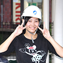 手作りのステッカーが貼られた女性専用のヘルメット。女性の皆さんに少しでも快適に講習を受けていただけるよう、今後も積極的に取り組んで行きます。